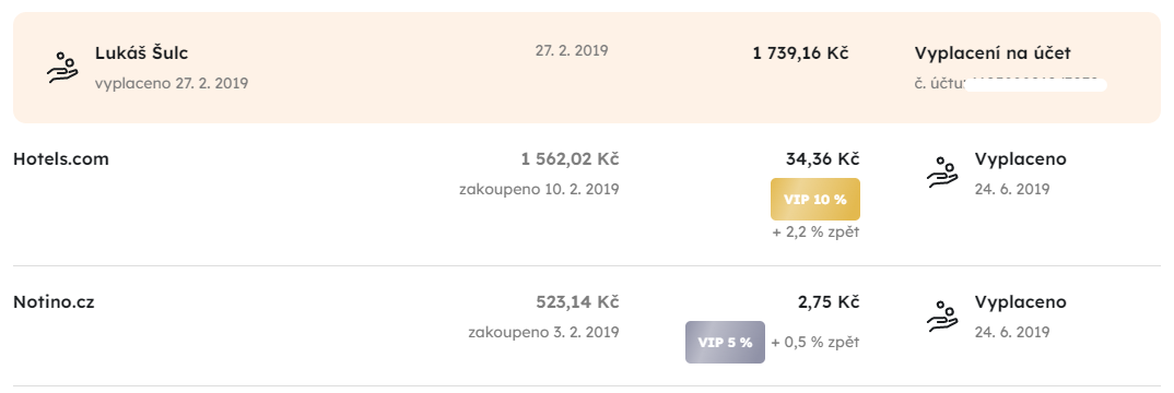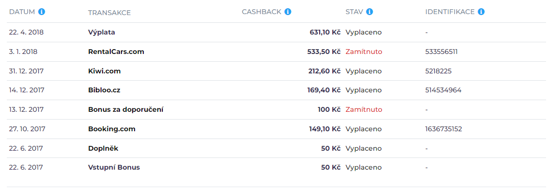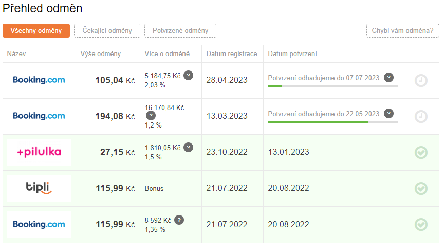 Na těchto portálech se vždy podívám, kde je větší cashback, a přes něj se na cílový e-shop prokliknu. Pokud tedy například někam cestuji a chystám se rezervovat hotel, tak se na portál Booking prokliknu přes jeden z cashbackových portálů a získám tak přibližně 3% zpět z ceny ubytování. Tady jsou vidět cashbacky, které jsem již inkasoval: