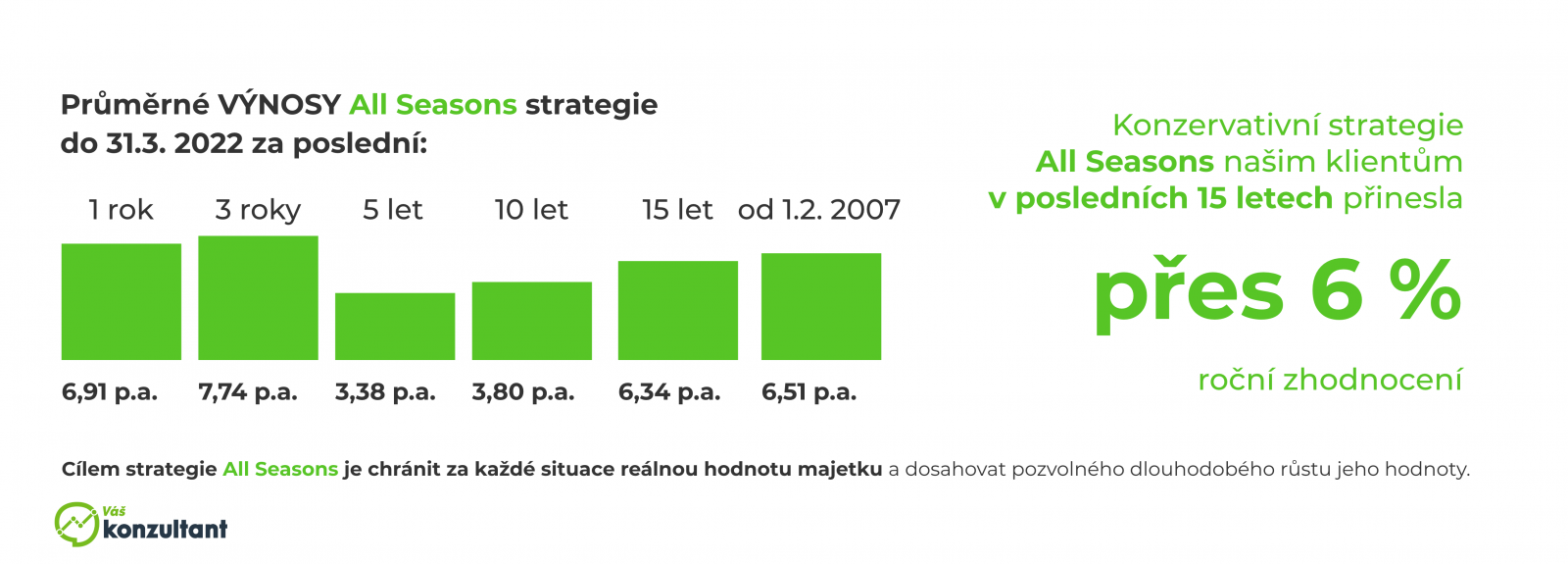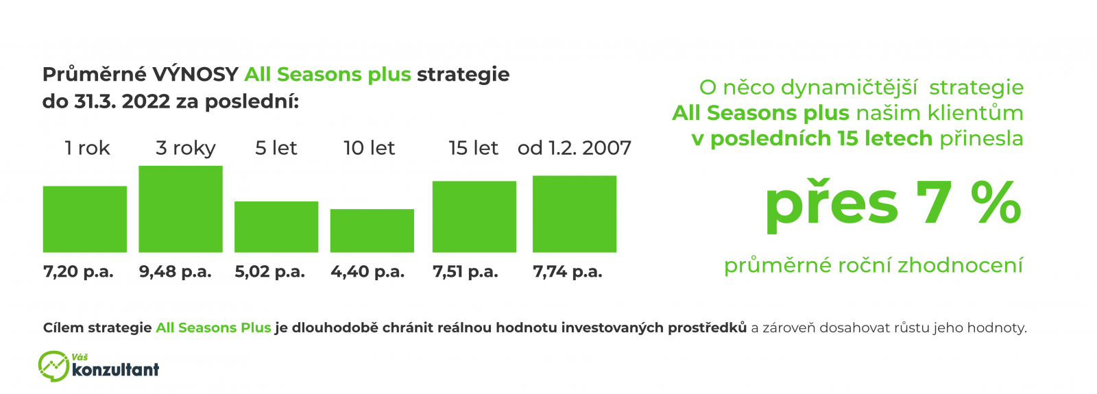 Pro naše klienty využíváme konzervativní strategii All Seasons, která klientům v posledních 15 letech přinesla přes 6 % roční zhodnocení a o něco dynamičtější (s vyšší akciovou složkou oproti dluhopisům) strategii All Seasons Plus, která v posledních 15 letech našim klientům přinesla více než 7 % průměrné roční zhodnocení.