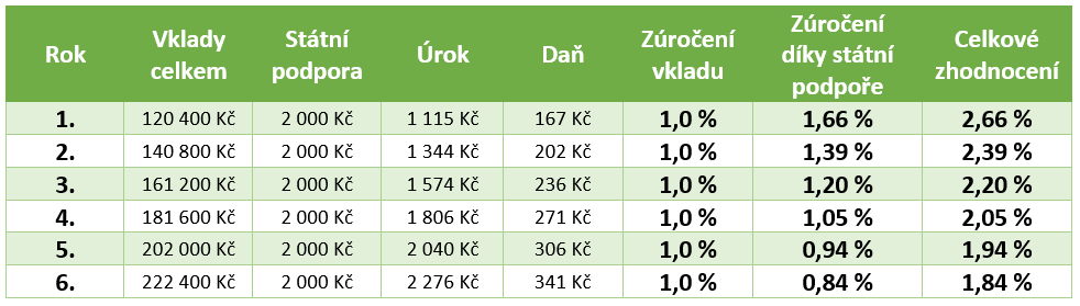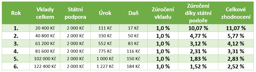 - Státní podpora 10% ročně z vkladu účastníka maximálně však 2 000 Kč